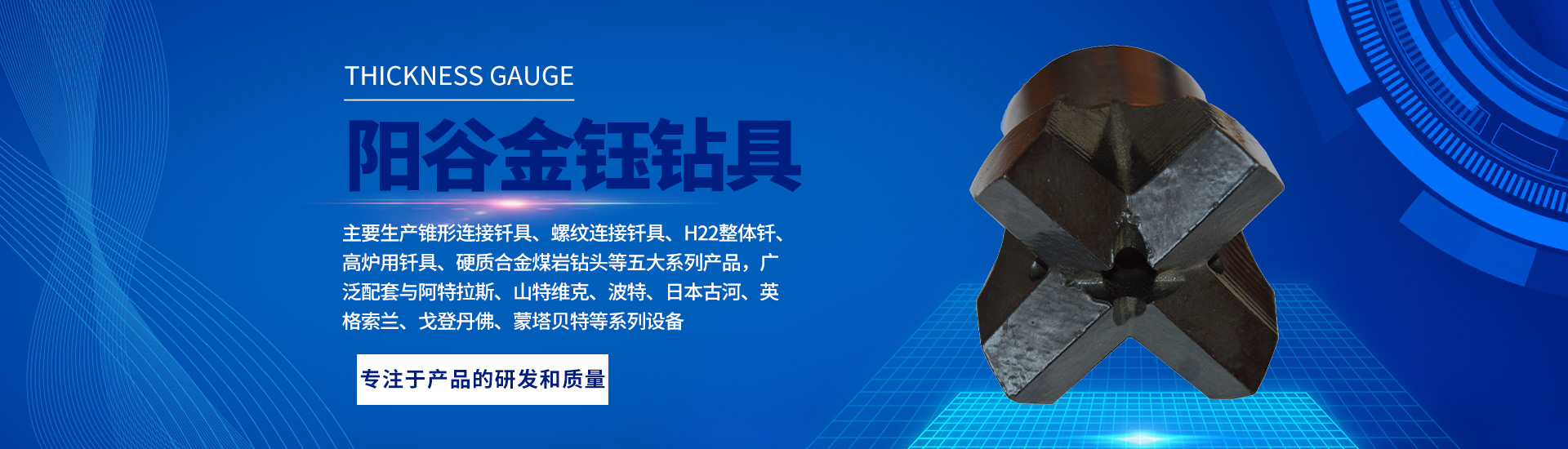 金鈺鉆具有限公司主要生產錐形連接釬具、螺紋連接釬具、H22整體釬、高爐用釬具、硬質合金煤巖鉆頭等五大系列產品,廣泛配套與阿特拉斯、山特維克、波特、日本古河、英格索蘭、戈登丹佛、蒙塔貝特等系列設備。